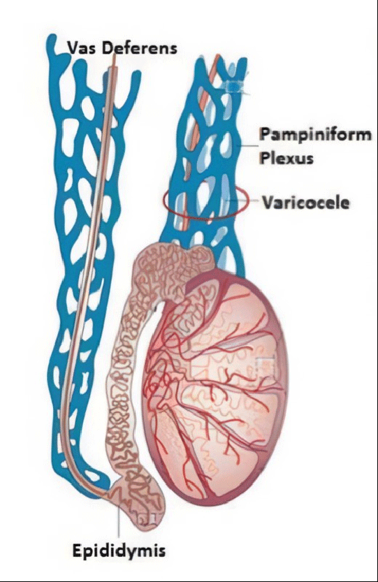 2、精索内静脉较长:在进入肾静脉的过程中出现直角现象,让血液流通受到阻力;