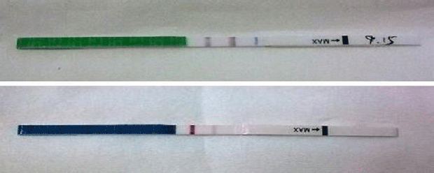怀孕看法:如果出现出现两条红线,检测线的红色明显强于对照线的颜色,则表现为已经怀孕;