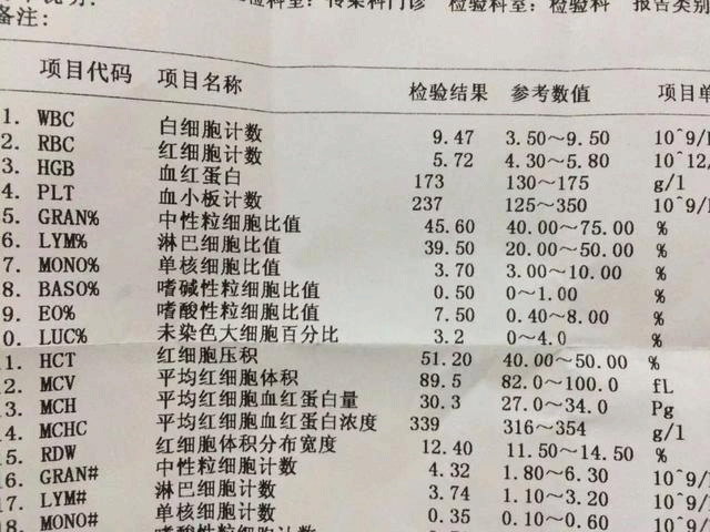 白细胞计数 | 白细胞如果增高说明出现感染,如白血病、尿毒症等。如果白细胞减低,考虑是放化疗之后或者传染病 |