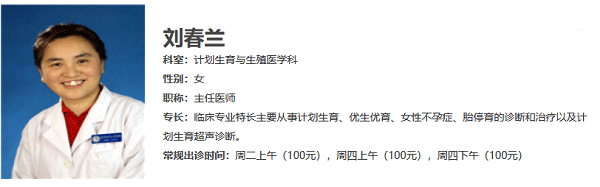 刘春兰,北京大学人民医院生殖医学科主任医师,副教授,1983年8月毕业于江苏省徐州医学院临床医学系,获学士学位。1996年7月毕业于北京医科大学第三临床医学院妇产科,获硕士学位。