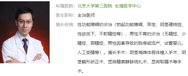 擅长性功能障碍的诊治(勃起功能障碍、早泄、阴茎硬结症、性欲低下、不射精症等),男性不育的诊治(无精症、少精症、弱精症、男性因素导致的胎停或流产、试管婴儿,人工受精等)。擅长手术:阴茎海绵体假体植入手术、阴茎畸形矫正术、显微精索静脉结扎术、显微取精术等手术。