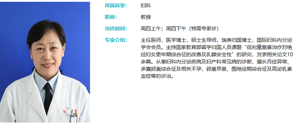 她主持国家教育部留学归国人员课题“极低剂量的雌孕激素治疗对绝经妇女更年期综合症的改善及乳腺安全性的研究”、大连市科技局课题““低剂量戊酸雌二醇及黄体酮胶丸治疗对绝经妇女乳腺密度的影响及乳腺安全性的研究”,在国际高质量专业杂志发表英文论文10数篇。专攻妇科内分泌疾病:从女性青春期、生育期、围绝经期到绝经期, 包括月经紊乱、闭经及排卵障碍性不孕症的诊治,以及经前期紧张综合征的诊治;特别是多囊卵巢综合征的诊断和治疗及远期并发症的预防;卵巢早衰、更年期综合征以及绝经相关疾病的诊断和治疗有丰富的临床经验。