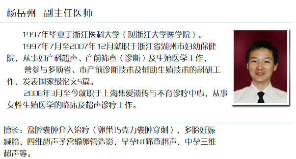 他主要从事妇产科超声、产前筛查(诊断)及生殖医学工作,曾参与多项省、市产前诊断技术及辅助生殖技术的科研工作,发表国家级论文5篇。2008年3月至今就职于上海集爱遗传与不育诊疗中心,从事女性生殖医学的临床及超声诊疗工作。
