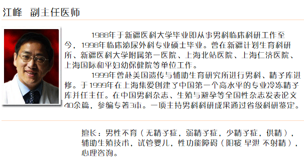 江峰,复旦大学附属妇产科医院集爱遗传与不育诊疗中心副主任医师,1988年于新疆医科大学毕业即从事男科临床科研工作至今三十二年,临床泌尿外科专业硕士毕业。