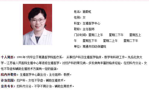 施蔚虹,南通市妇幼保健医院生殖医学中心主任医师教授,生殖医学中心副主任、主任医师,教授。1991年7月毕业于南通医学院医疗系,从事妇产科及生殖医学临床、教学和科研工作。先后北京大学、江苏省人民医院生殖中心等进修生殖医学。