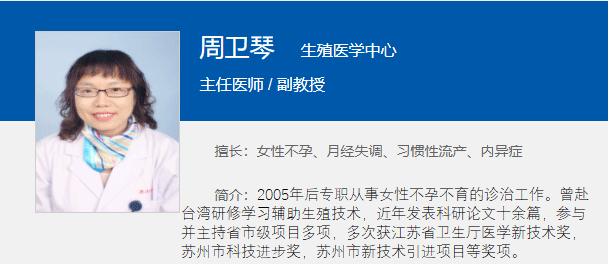 周卫琴,苏州大学附属第一医院生殖中心主任医师 ,副教授,硕士生导师。苏州大学附属第一医院生殖医学中心临床负责人。江苏省医师协会生殖医学专委会委员,苏州市医学会妇产科学会妇科内分泌学组副组长,苏州市医学会妇产科学分会VET学组委员,中国医师协会医师健康管理与医师健康保险专委会委员,苏州市医学会肿瘤学专业委员会MDT学组委员。