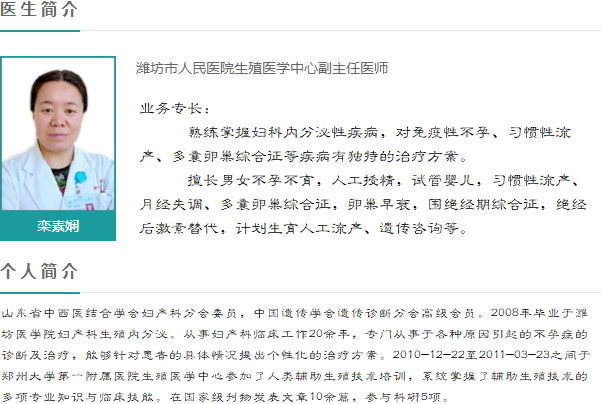栾素娴,潍坊市人民医院生殖医学中心副主任医师,山东省中西医结合学会妇产科分会委员,中国遗传学会遗传诊断分会高级会员。2008年毕业于潍坊医学院妇产科生殖内分泌。