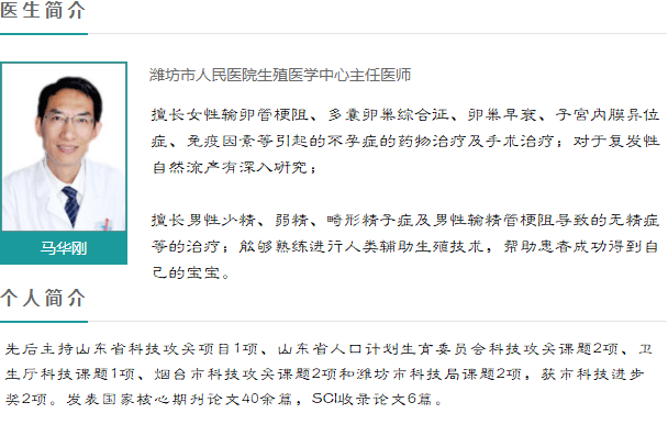 马华刚,潍坊市人民医院生殖医学中心主任医师,教授,生殖医学博士,硕士研究生导师、同济医学院生殖健康研究所兼职教授。中国中西医结合学会生殖医学专业委员会委员、中华医学会计划生育学会生殖保健学组委员、山东省生殖医学会委员、山东省医学会医学遗传与优生学分会委员、山东省中西医结合男科学会副主任委员、山东省中西医结合生殖医学会委员、潍坊市计划生育学会主任委员、潍坊市预防医学会生殖健康专业委员会主任委员,潍坊市生殖医学会副主委、潍坊市医师协会妇产科分会副主委。