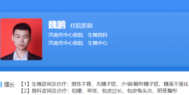 魏鹏,济南市中心医院生殖男科住院医师,2020年9月开始在济南市中心医院生殖男科工作至今。