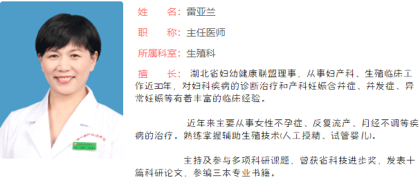 雷亚兰,湖北省妇幼生殖科主任医师,湖北省妇幼健康联盟理事,从事妇产科、生殖临床工作近30年,对妇科疾病的诊断治疗和产科妊娠合并症、并发症、异常妊娠等有着丰富的临床经验。