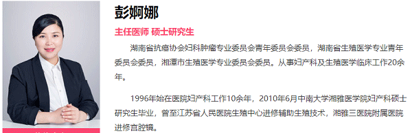 彭婀娜,湘潭市中心医院生殖与遗传中心主任医师,硕士研究生,毕业于中南大学湘雅医学院,湖南省生殖医学会青年委员,湘潭市生殖医学会委员。