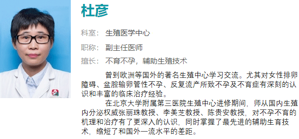 杜彦,中山市博爱医院生殖中心副主任医师,广东省生殖医学伦理学组委员、广东省医师协会会员、中华医学会会员、中山市医学会会员。从事生殖医学临床工作20多年,曾到欧洲等国外的著名生殖中心学习交流。尤其对女性排卵障碍、盆腔输卵管性不孕、反复流产所致不孕及不育症有深刻的认识和丰富的临床治疗经验。