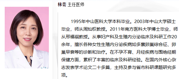 朱女士的评价:林医生真的超级好,还亲手做B超,就是好多人在排队,我今天排了一下午,林医生居然叫我小猪妹妹,让我放松心情来,月经来就促排,希望一次就中。