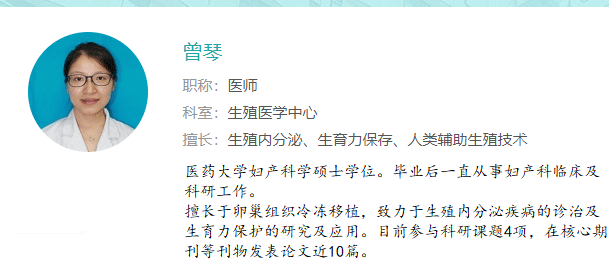 曾琴,四川省妇幼保健院生殖医学中心住院医师,2013年毕业于成都中医药大学临床医学系,2016年获成都中医药大学妇产科学硕士学位。