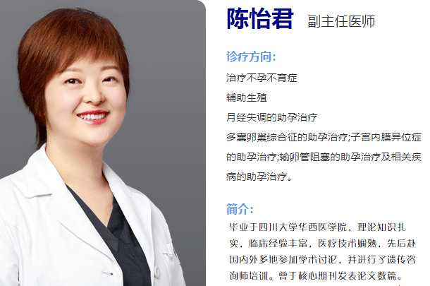 陈怡君,成都西囡医院副主任医师,硕士,毕业于四川大学华西医学院,2006年 工作至今,于华西附二院妇产科行规范化培训五年,于成都第二人民医院妇产科工作三年,理论知识扎实,临床经验丰富,医疗技术娴熟。
