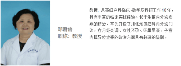 邓君碧,川北医学院附属医院生殖医学中心教授,从事妇产科临床、教学及科研工作40年,具有丰富的临床实践经验。