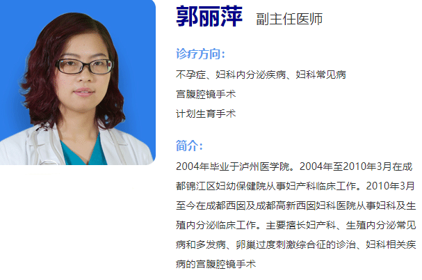 郭丽萍,成都西囡妇科医院妇科副主任医师,2004年毕业于泸州医学院。2004年至2010年3月 在成都锦江区妇幼保健院从事妇产科临床作。2010年3月至今在成都西囡及成都高新西囡妇科医院从事妇科及生殖内分泌临床工作。