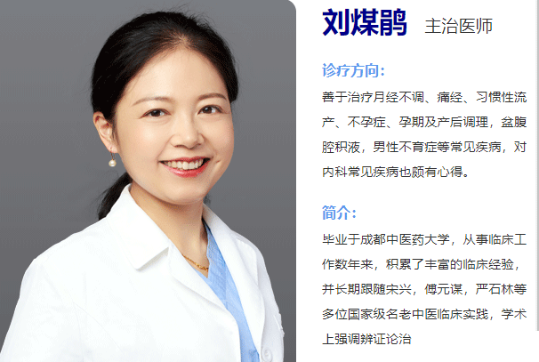 刘煤鹃,成都西囡妇科医院主治医师,毕业于成都中医药大学。从事临床工作数年来,积累了丰富的临床经验。