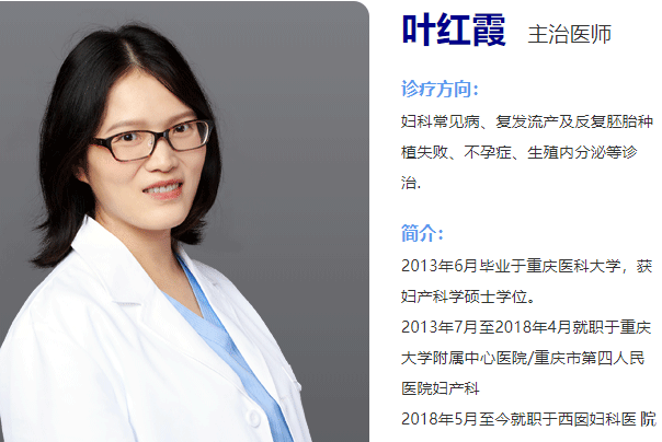 叶红霞,成都西囡妇科医院生殖免疫科主治医师,2013年6月毕业于重庆医科大学,获妇产科学硕士学位;2013年7月至2018年4月就职于重庆大学附属中心医院/重庆市第四人民医院妇产科;2018年5月至今就职于西囡妇科医院。