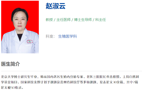 赵淑云,贵州医科大学附属医院生殖中心主任医师,教授,博士生导师。1990年择优留校工作至今,在妇产科工作26年,2002年硕士研究生毕业,2007年北京大学博士研究生毕业,师从国内著名生殖内分泌专家、北医三院院长乔杰教授。