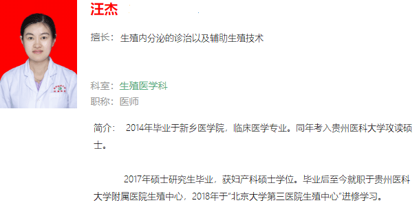 她于2017年硕士研究生毕业,获妇产科硕士学位。毕业后至今就职于贵州医科大学附属医院生殖中心,2018年于“北京大学第三医院生殖中心”进修学习。