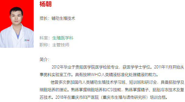 杨朝,贵州医科大学附属医院主管技师。2012年毕业于贵阳医学院医学检验专业,获医学学士学位。2011年11月开始从事男科实验室工作,具有按照WHO人类精液标准化处理精液的能力。