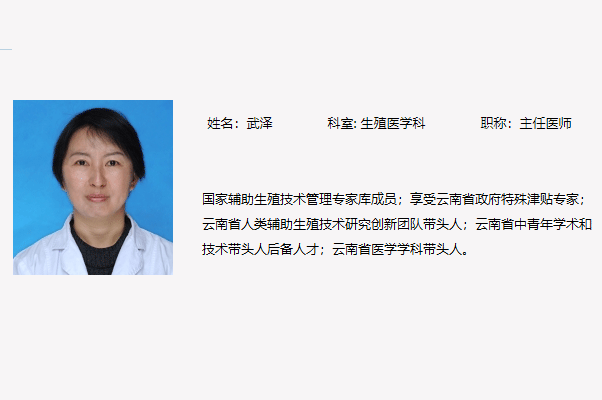 武泽,云南省第一人民医院生殖医学科主任医师,副教授,医学博士、博士生导师,生殖医学科副主任。主要从事生殖内分泌疾病的诊断和治疗、应用促排卵、体外授精胚胎移植技术(试管婴儿)等不同方法治疗不孕症。
