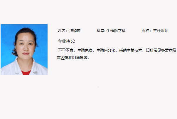 拜如霞,云南省第一人民医院生殖医学科主任医师,硕士研究生,1996年毕业于大理医学院临床医学专业,获学士学位,2013年云南中医学院获硕士研究生学位,1996年至2001年在楚雄州医院妇产科工作。