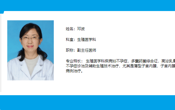 邓波,云南省第一人民医院生殖医学科副主任医师,生殖医学硕士,1997年湖南医科大学医疗系毕业。