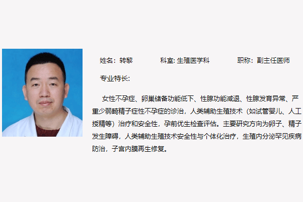 转黎,云南省第一人民医院生殖医学科副主任医师,讲师,医学博士、美国哈佛大学医学院博士后、硕士生导师、云南省生殖医学后备人才、云南省生殖遗传疾病临床医学中心核心成员。