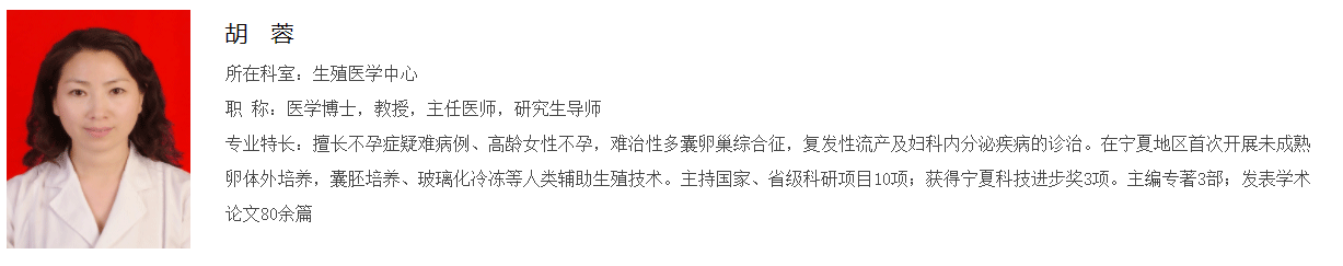 胡蓉,宁夏医科大学总医院生殖医学中心主任医师、教授。